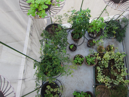 ○北テラスガーデン 北テラスでは、緑化のための実験用植物として、芝生とツルニチニチ草を育てて います。芝生の生育状態は良いとは言えませんが、ツルニチニチ草の方は問題なく 育っています。夏野菜が終わったので、ルーバーから吊るしているのは、ハーブが中心になっています。